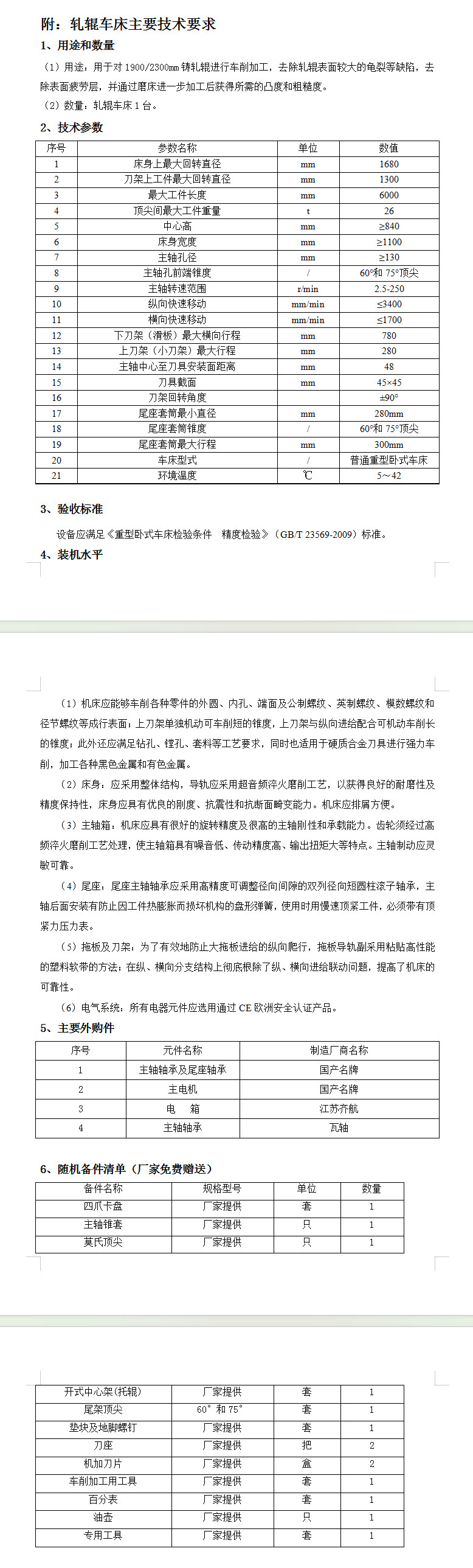 ①、申请人资质要求:投标方具备轧辊车床销售业绩,专业生产轧辊车床厂家,提供证明材料(合同、发票)。