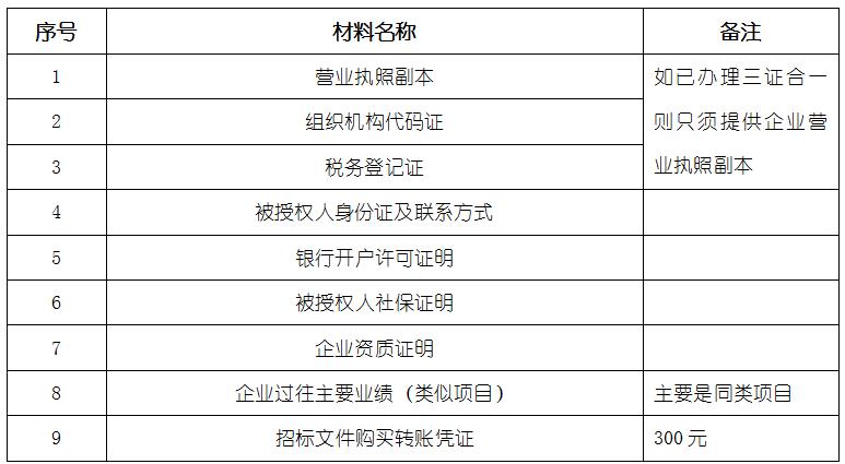 2、 凡有意向参加投标者,请在上述期间内按下表提供报名资料,相关证明文件的原件如无法提供原件则提供复印件加盖公司公章,投标人须将上述资料的扫描件发邮件至招标联系人处进行报名。