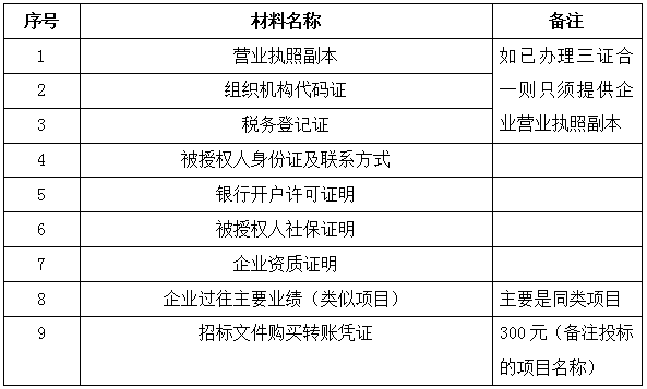 2、 凡有意向参加投标者,请在上述期间内按下表提供报名资料,相关证明文件的原件如无法提供原件则提供复印件加盖公司公章,投标人须将上述资料的扫描件发邮件至招标联系人处进行报名。