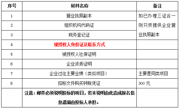 2、 凡有意向参加投标者,请在上述期间内按下表提供报名资料,相关证明文件的原件如无法提供原件则提供复印件加盖公司公章,投标人须将上述资料的扫描件发邮件至招标联系人处进行报名。