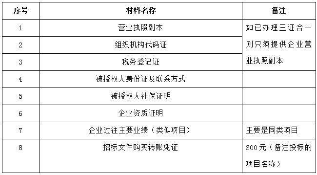 2、 凡有意向参加投标者,请在上述期间内按下表提供报名资料,相关证明文件的原件如无法提供原件则提供复印件加盖公司公章,投标人须将上述资料的扫描件发邮件至招标联系人处进行报名。