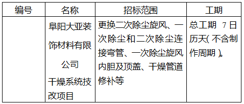 阜阳大亚装饰材料有限公司干燥系统技改项目招标公告