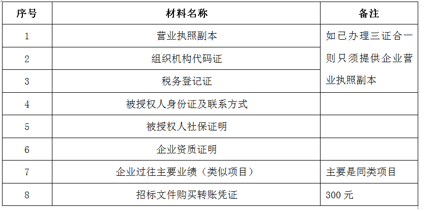 4、 获取时间为本招标公告截止后,由招标人统一发放,本公告公示期间为:2020年9月28日12时起至2020年10月3日12时。凡有意向参加投标者,请在上述期间内按下表提供报名资料,相关证明文件的原件如无法提供原件则提供复印件加盖公司公章,投标人须将上述资料的扫描件发邮件至招标联系人处进行报名。